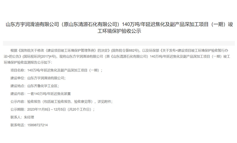 山東方宇潤滑油有限公司(原山東清源石化有限公司)140萬噸/年延遲焦化及副產(chǎn)品深加工項(xiàng)目(一期)竣工環(huán)境保護(hù)驗(yàn)收公示